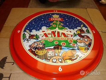 Orologio da parete datato primi anni 90 realizzato in latta smaltata in occasione del Natale e dedicato alla casa birraria Ceres nella tipologia x-mas.