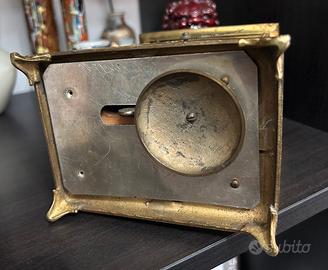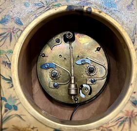 Raro orologio da tavolo pendule d'officier Grand Prix de l’Horlogerie 1878, meccanico a carica meccanica, corpo dipinto con motivi floreali e uccelli su metallo ed applicazioni in bronzo dorato. Sembra funzionante però sicuramente e