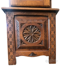 Orologio pendolo a colonna d’epoca anni 50 di fabbricazione Francese, movimento con 2 pesi in fusione di ghisa. Mobile in legno massello di pregio e intagliato, assemblato in 3 parti. Il quadrante, smaltato, con numeri romani, è incastonato da una lamina di bronzo sbalzata con vari motivi raffiguranti grappoli, foglie, fiori e decorazioni. Meccanismo funzionante, suona le ore e le mezz’ore. Ripulito e lubrificato da un esperto. Dimensioni: Altezza 208 cm. ; Larghezza max 50 cm. ; Profondità max 27cm. L’oggetto si trova in Francia a 167 Km da Torino, Dipartimento delle Hautes-Alpes. Su richiesta può venire adeguatamente trasportato in Italia sia al confine (Monginevro o Clavière) sia in Val Chisone. Si accettano anche offerte ma nei limiti del ragionevole. Se l’oggetto è on-line significa che è disponibile. Grazie.