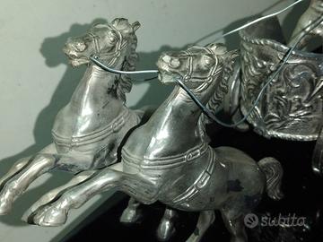 ANTICO OROLOGIO LIBERTY DA CAMINO MOLTO GRANDE E PESANTE ANNI 30/40. MOLTO BELLO MA HA SUBITO DELLE MODIFICHE NEL TEMPO . L'OROLOGIO CREDO NON SIA ORIGINALE ANCHE SE MECCANICO , FORSE SOSTITUITO CON UNO DI EPOCA ANNI 50 O 60 . UN CAVALLO HA UN PIEDE SPEZATO E SONO STATE AGGIUNTE DELLE VITI AI PIEDI E LA CARROZZA E MANCANTE DELLA STAFFA DI AGGANCIO DEI CAVALLI . FISSATO SU BANE NERA DI VETRO PRESENTA DUE COLONNE A SPECCHIO CHE RICHIAMA LO STILE IMPERO . LA CASETTA DOVE E RIPOSTO L'OROLOGIO , LE PARETI SONO IN VETRO CON DISEGNI DI FOGLIE , IL RESTO E IN LEGNO