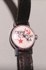 Orologio a carica manuale funzionante Zarya con scritta Perestrojka sul quadrante. Originale russo con carta di produzione e scatola, modello da donna con cinturino in pelle, tutto originale fine anni '80.