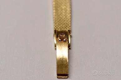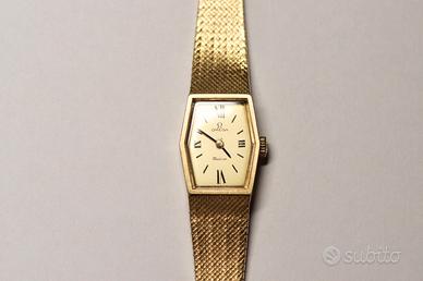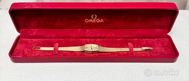 Orologio da donna marca Omega modello vintage (prodotto negli anni 70), calibro Omega 485, carica manuale, quadrante con indici a bastone , cassa esagonale (15mm x 20mm) e bracciale a maglie entrambi in oro giallo 18K, vetro in plastica, peso 36 gr., revisionato e lucidato ottobre 2023 presso centro assistenza autorizzato Omega (come da relativo certificato in foto), completo di scatola originale della Casa. Solo consegna a mano Roma e provincia.