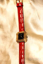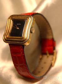 OR890 Raro orologio "vintage" da donna in oro placcato "carrèe" a forma rettangolare stondato con cinghietta in vera pella color arancione. Si tratta di un raro orologio da polso originale d'epoca, marca Seiko, di ottima manifattura orologiaria Svizzera. Movimento meccanico a carica manuale. Quadrante con fondo nero traslucido. Lancette dorate. Marchiato sul quadrante, " Seiko - Japan 11 - 3880 R ". Marchiato sul fondello esternamente " Seiko - Sgp Back St. Steel - 550951 - 11-4200 - Japan - B ". Segnature a mano di avvenute revisioni all'interno del fondello. Marchiato sul calibro " Seiko Japan - 17 j II A " Fondello con chiusura a scatto. Ottime condizioni comprese le partri maccaniche, funzionante con tenuta dell'ora. Giappone Metà '900 H. max. cassa, 2,5 cm. Larg. cassa con corona, 2,4 cm. Spess. cassa, 0,7 cm. Lunghezza disteso a terra aperto, 20,3 cm. Peso, 18 gr. Spedizione assicurata con corriere veloce tracciabile con costo da concordare. Per cortesia contattatemi solo se realmente intenzionati. Non chiedetemi se disponibile. Gli annunci venduti, vengono rimossi immediatamente. Questo é un negozio on-line a prezzi fissi. Sono a disposizione al Il venditore dichiara che il bene oggetto del presente annuncio è originale.