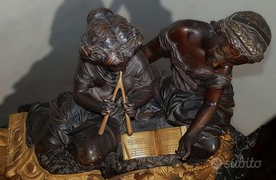 Vendo orologio da mobile in bronzo, di fabbricazione francese, risalente al diciannovesimo secolo. L’orologio è costituito da una base in bronzo dorato, riccamente decorata in stile neobarocco, sopra la quale sono poste due figure femminili, sempre in bronzo, nell’atto di svolgere una lezione di musica.
