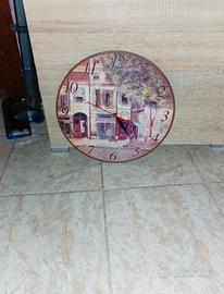 Orologio da parete con un'immagine di una strada parigina. -Diametro:34 - Design rotondo. - Cornice in legno. - Lancette rosse e nere.