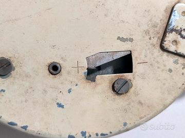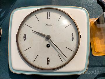 Orologio da parete vintage in ceramica prodotto dal marchio tedesco Kienzle, risalente indicativamente agli anni '50 o '60. Questi modelli erano comunemente utilizzati come orologi da cucina e presentano caratteristiche tipiche del design di metà secolo (Mid-Century): Cassa in ceramica bianca (o porcellana) con bordi arrotondati, quadrante protetto da un vetro bombato con cornice in ottone. Si tratta di un orologio a carica manuale. È visibile un foro sul quadrante, appena sopra la cifra 6, destinato all'inserimento della chiave per caricare la molla