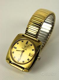 OR895 Originale orologio "vintage" da uomo in acciaio dorato con cassa quadrangolare e cinghietta metallica elastica. Marca " Croton " Movimento meccanico a carica automatica. Quadrante tondo con fondo oro champagne. Indici e lancette a bastone. Datario al "3" Marchiato sul quadrante, " Croton - Aquamatic - Swuiss made ". Marchiato sul fondello esternamente " Shock resistant Base Metal Top Steel Back Water - 6L 23405 ". Marchiato internamente " Croton Watch Co. Inc. Swiss " Segnature a mano di avvenute revisioni all'interno sul fondello. Marchiato sul calibro " Croton Watch Co. Inc. - AXHK F 405 - 17 Seventeen Jewels ". Fondello con chiusura a vite. Cinturino metallico dorato e cromato elastico. Ottime condizioni e funzionante con tenuta dell'ora. Svizzera 1960 C.ca H. max. cassa, 3,8 cm. Diametro cassa senza corona, 3,5 cm. Spess. cassa, 1,1 cm. Peso, 75 gr. Spedizione assicurata e/o raccomandata e tracciabile con costo da concordare. Per cortesia contattatemi solo se realmente intenzionati. Non chiedetemi se disponibile. Gli annunci venduti, vengono rimossi immediatamente. Questo é un negozio on-line a prezzi fissi. Sono a disposizione al