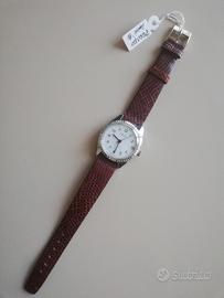 Vendo orologio da polso marca Perseo (Swiss made) originale anni ’60, meccanico a carica manuale con datario, cinturino originale in pelle di lucertola marrone, quadrante bianco a numeri arabi, edizione speciale per FF.SS. italiane (fornitura ufficiale in corso dal 1927) con logo sul fondello inox chiuso a vite, funzionante, mai indossato e pari al nuovo, prezzo favorevole per investimento/collezione. Diametro 30 mm (escl. corona), vetro plexi, impermeabilità “waterproof”, antimagnetico, antiurto “incabloc”. Modello tuttora in produzione (mod. “Moderna lady” al quarzo, sito “perseo-watches.it”).