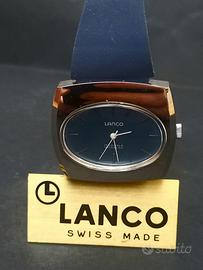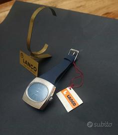 Orologio da polso vintage Lanco svizzero carica manuale ,noto per la produzione di movimenti di manifattura e modelli L'esemplare nella foto è un modello degli anni '70, caratterizzato da una cassa di forma tonneau che era popolare in quel decennio.Cinturino in pelle blu.
