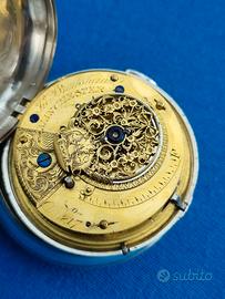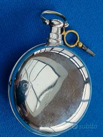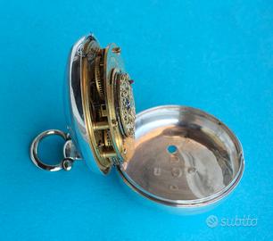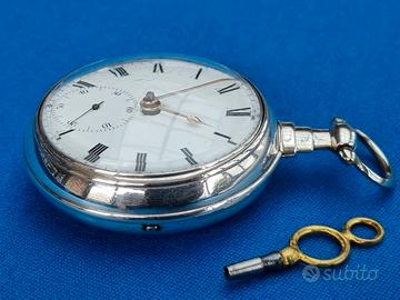 Antico, originale e raro orologio cronografo inglese da taschino per uomo, con doppia cassa in argento sterling, cassa interna con punzoni per Chester 1809, con splendido movimento altamente rifinito e inciso " John Bradshaw Manchester No 817", in ottime condizioni, che funziona bene ed esegue l’intera lunghezza della catena. Funzionamento meccanico a carica manuale con scappamento a verga. Stupendo quadrante in porcella smaltata bianca con indici delle ore in numeri romani e piccolo contatore dei secondi a ore sei (modello di orologio denominato “Doctor’s” perché richiesto dai medici del periodo). Le lancette sono originali ed in ottime condizioni. L’orologio è corredato di un vecchio documento di riparazione effettuata da un orologiaio inglese. Il ponte del bilanciere ha un grande diametro, come segno di un movimento di alta qualità. Splendido come fosse nuovo il fondello punzonato. Un orologio bellissimo, autentico pezzo di storia di oltre 200 anni. Entrambe le casse sono marchiate per Chester 1809 e sono in ottime condizioni, le cerniere sono belle e robuste, tutte le copertine si chiudono in stretta aderenza. Vetro cristallo bombato originale. Cassa esterna in argento sterling massiccio in ottime condizioni, lucidata a mano, del diametro di 55 mm; diametro cassa interna 49 mm. Orologio di spessore 25 mm e peso di 150 grammi. Regolazione del tempo con chiavetta, agendo sul perno centrale del quadrante.