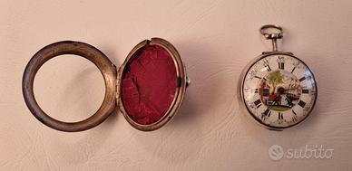 Antico e raro orologio da tasca, con doppia cassa in argento sterling, prodotto a Londra nel 1770 circa dal famoso orologiaio inglese Samson, serie numero 15258. Questo orologio è descritto ed illustrato a pag. 89 tavola 21 sezioni 104-105 del libro “Orologi dal 1500 al primo ‘900” di Fulgido Pomella, Priuli & Verlucca Editori 1986. La cassa esterna ha una pregevole incisione a sbalzo. Funzionamento meccanico a carica manuale con scappamento a verga, splendido movimento inciso "Samson London 15258", in ottime condizioni, che funziona bene ed esegue l’intera lunghezza della catena. L’orologio ha uno stupendo quadrante originale in ceramica smaltata, dipinto a mano di tipo olandese, con indici delle ore in numeri romani, con alcune linee sottili e due chips in corrispondenza rispettivamente delle ore VI e VII. Il ponte del bilanciere ha un grande diametro, come segno di un movimento di alta qualità. Vetro cristallo bombato con lente centrale. La cassa ha un diametro di 50 mm; l’orologio ha uno spessore di 26 mm ed un peso di circa 89 grammi. Regolazione del tempo con chiavetta in dotazione, agendo sul perno centrale del quadrante. Trattativa telefonica.