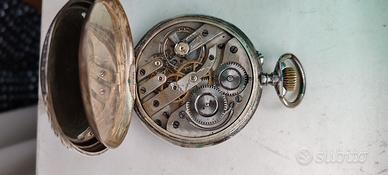 Orologio da tasca Ancre signe droite 15 rubis numerato e marchiato 0800 EP, cassa in argento. Diametro 6cm. Non funzionante. Condizioni come da foto.