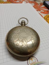 Orologio Hampden watch co. Smalto bianco con numeri romani neri per le ore e una scala esterna a puntini per i minuti. quadrante ausiliario per i secondi.in metallo Silveroid ( nickel e argento) del XIX. Nostra segni di usura crepa sul vetro. Sul retro scena paesaggistica - motivi floreali.