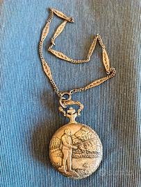 Orologio da tasca, da collezione, WILLE FRERES, di famiglia, con custodia con bassorilievo e catena UnoaErre. In argento, cesellato a mano