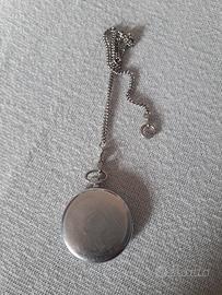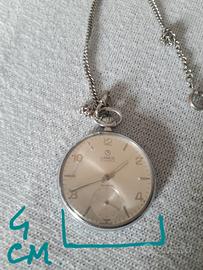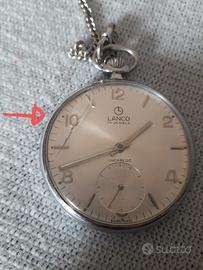Raro orologio Lanco da 17 e non 15 jewels con i secondi. In metallo. Carica manuale con meccanica svizzera. Incabloc. Diametro cm. 4. Completo di catenella di 33 cm. Il vetrino purtroppo è rovinato, come da foto, ma liscio al tatto. FUNZIONANTE.