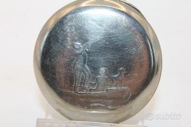 L'orologio da tasca "Moeris Swiss Made" dei primi del Novecento, con la sua cassa in acciaio di 50 mm e un peso di 83,8 grammi, è un pezzo di notevole fattura. La cassa è finemente cesellata, adornata con un motivo di caccia che ne esalta il carattere storico e artigianale. Il meccanismo interno, sebbene completo, necessita di una revisione per tornare in funzione. Questo orologio rappresenta un esempio di orologeria svizzera d'epoca, combinando l'eleganza del design con la precisione meccanica.