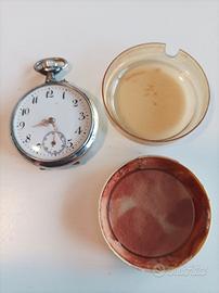 Orologio da taschino, in argento, inizi 900, funzionante, con sua custodia originale, e vetrino di scorta. Mai usato. Non faccio spedizioni.