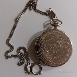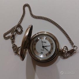 L'immagine mostra un orologio da taschino vintage del marchio milaneseDe Wan, caratterizzato da un movimento al quarzo. Questo tipo di orologio, spesso chiamato in gergo "cipolla" per la sua forma arrotondata e la protezione del quadrante, rappresenta un classico accessorio di stile retrò