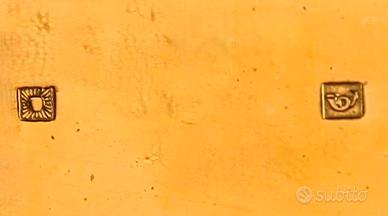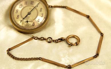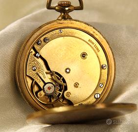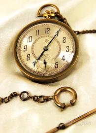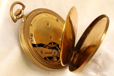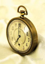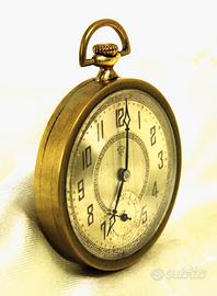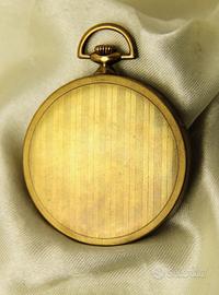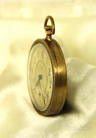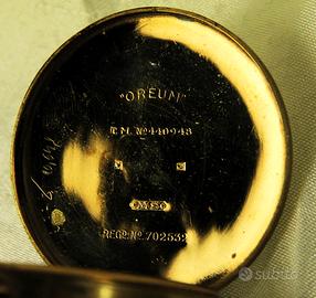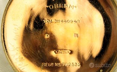 OR908 Originale orologio da tasca con cassa pesante " a moneta " in ottone e rame a tre sportelli in perfetto stile " Art Decò ". Raro orologio prodotto dal 1903 al 1908 da L. Tièche-Gammeter di Soleure (Swiss) Marca " LTG ". Modello " OREUM ". Movimento meccanico con scappamento ad ancora a carica manuale tramite rotellina zigrinata e sistema di regolazione a molla, sulla rotellina. La corona di carica è sormontata da un gancio ad arco per catena. Marchiato sul calibro " Swiss made " Marchiato sul primo sportello internamente " OREUM " T.M. N° 440948 - MS - REG d. N° 702532 - 2 marchietti a lato in incuso, con i simboli del " girasole " e del " corno inglese ". Varie inscrizioni e date all'interno, indicanti avvenute revisioni. Marchiato sul secondo sportello internamente" OREUM " Altre inscrizioni di avvenute revisioni. Quadrante originale argentato in perfette condizioni, con grandi numeri arabi neri e doppia greca circolare ad anello. Lancette nere " Art Decò ". Secondi al " 6 ". Marchiato al centro del quadrante " LTG " Fornito con catenella da taschino, originale e coeva in ottone e rame. Bella e piacevole patina dorata. Ottime condizioni senza botte o incrinature. Funzionante con tenuta dell'ora. Svizzera Primi '900 (1903 - 1908) H. max. 6,1 cm. L max. 4,7 cm. Spess. max. 1,1 cm. Peso, 76 gr. Spedizione con Posta o corriere veloce e tracciabile con costo da concordare. Per cortesia contattatemi solo se realmente intenzionati. Non chiedetemi se disponibile. Gli annunci venduti, vengono rimossi immediatamente. Questo é un negozio on-line a prezzi fissi. Sono a disposizione al