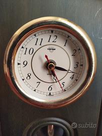 Orologio da tavolo a pendolo VIRTIME – Stile Vintage/Classico Splendido orologio da appoggio firmato Virtime, perfetto per dare un tocco di eleganza rétro a una scrivania, un mobile da soggiorno o una mensola. Design: Cassa in legno scuro con finiture eleganti e cornice del quadrante dorata. Dettagli: Il quadrante bianco presenta numeri arabi ben leggibili. Nella parte inferiore è visibile il pendolo in movimento. Meccanismo: Funzionamento al quarzo (preciso e silenzioso). Alimentato a batteria (stilo AA). Stile: Classico / Old Money / Vintage decor. Condizioni: Ottime, perfettamente funzionante, qualche piccolo graffio legato all'età. Dimensioni ideali per non ingombrare ma farsi notare. Un pezzo d'arredo senza tempo!