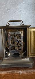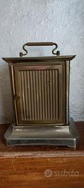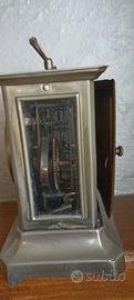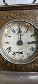 orologio da tavolo Junghans d'epoca, probabilmente una sveglia risalente intorno al 1900. Produttore: Junghans, rinomata azienda orologiera tedesca. Caratteristiche: Cassa decorativa in metallo, quadrante con numeri romani e quadranti secondari interni. Stile: Design antico/vintage con maniglia superiore per il trasporto. Stato: Oggetto da collezione che riflette la precisione e la qualità artigianale della Germania di quell'epoca.