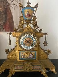Sconto natalizio ! Da 1300 a 800 Orologio francese della metà del XX secolo. Oggetto in bronzo e ottone dorato e cesellato, adornato da elementi in ceramica dipinta a mano con decori floreali di grande piacevolezza.