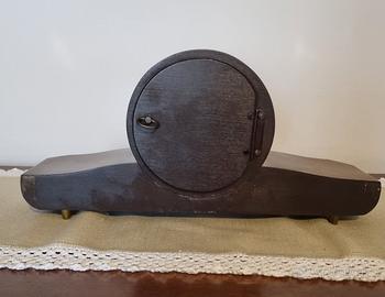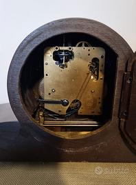 Orologio a pendolo da tavolo, stile anni '40-'60, con cassa in legno lucido, quadrante in stile classico e movimento a carica manuale. Sono presenti due fori per la ricarica: uno per il movimento e uno per la suoneria. Chiave di carica inclusa. Lo sportello è apribile per caricare l'orologio ed il vetro è bombato. L'orologio è usato ma funzionante e la suoneria su gong è gradevole. Condizioni estetiche molto buone.