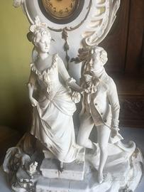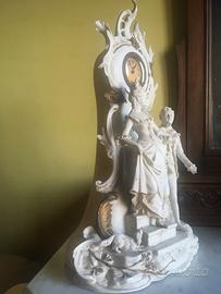 Orologio Kienzle incastonato nella raffigurazione di dama con cavaliere in ceramica di Capodimonte, disegno raffinato ed elegante. Altezza cm 41. Meccanismo del'orologio da controllare.