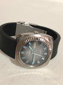 Orologio Lanco Airvac 6000 anni 70 Automatico-Day-Date- Cassa Oversize . Modello in acciaio, con quadrante molto bello nonostante i suoi circa 50 anni, stupendo colore del quadrante grigio scuro sfumato/cangiante: difatti nella parte degli indici azzurrati, man mano diventa di un grigio sfumato più chiaro verso il centro del quadrante. Vetro plexi, cassa acciao massiccio monoblocco, fondello a vite, Movimento automatico con raro brevetto "Piquerez" prodotta solo per un breve periodo nei primi anni '70. LA ULTRA RARE AIRVAC CASE era un design originale di una custodia prodotta e brevettata da Ervin Piquerez-Fresand. L'aria veniva estratta una volta assemblato l'orologio, in modo che il movimento agisse nel vuoto (con notevoli vantaggi meccanici, resistenza e precisione). Questo tipo di custodia è stata utilizzata da diverse marche, Glycine, Lanco, Tissot" . Cassa fuori misura di 41 mm di acciaio massiccio esclusa di corona. movimento di pregio e qualità con sistema antiurto, orologio perfettamente funzionante, cinturino nero in gomma caucciù impermeabile con chiusura deployante. Orologio storico e molto raro, si prega di controllare tramite motore di ricerca Google sul web, come il “Lanco Airvac 6000”, abbia raggiunto richieste molto elevate, e sara’ negli anni di sicuro sempre + un modello di valore collezionistico. Il mio prezzo in confronto e’ davvero ottimo, meno della meta’ delle richieste di altri venditoti pubblicati sul web , vedi prezzo anche su C24 ( identico al mio, con piccola variante: il mio Aivac600 e’ day-date, quello su C24 e’ solo con data….Guardate i miei feed, sono orologi che il sottoscritto ha collezionato negli anni.