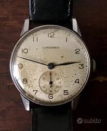 Orologio LONGINES svizzero originale in tutte le sue parti anni 40/50 in acciaio, si evince che la ghiera di carica è in blocco solo in senso orario, dovuto non ad una rottura ma allusura del tempo, lancette libere nella rotazione