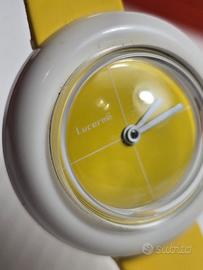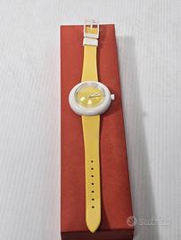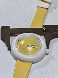- Cassa in acrilico 38 mm bianca e cinturino giallo, - Vetro trasparente a sfera. - Quadrante giallo magnifico