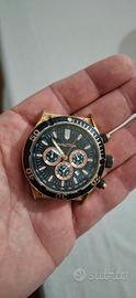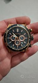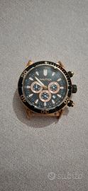 Alimentazione/Movimento: Al quarzo Tipo carica: Al quarzo Display: Analogico Funzioni: Cronografo Impermeabilità: 10 ATM water resistant Materiale cassa: Acciaio placcato oro rosa Colore cassa: Nero Colore quadrante: Nero Diametro cassa (mm): 44 Spessore cassa: 15 Orologio Nautica Cronografo da uomo, cassa in acciaio PVD oro rosa, ghiera girevole in PVD nero con dettagli PVD ora rosa, cinturino in gomma, impermeabile 100 metri. L'orologio viene venduto senza cinturino. Il modello richiede il suo cinturino specifico Nautica (serie NST / NSR) con attacco sagomato per una corretta aderenza alla cassa.