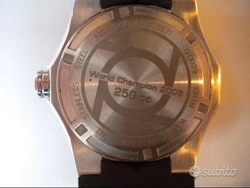 Orologio celebrativo per il pilota vincitore mondiale moto c.c. 250 anno 2008, tiratura limitata non numerata l' orologio è stato prodotto in pochi esemplari non per la vendita al pubblico nuovo con scatola -garanzia (scaduta nel 2009)-istruzioni, l'orologio è perfettamente funzionante tutti gli anni viene controllato e sostituito la pila. Valuto anche offerte. Solo consegna a mano