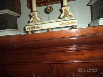 Orologio denominato parigina francese della II metà dell'800. Costruito in alabastro( o marmo) con fregi in bronzo. Integro non evidenzia danni ed è completo di chiave originale, pendolino e campanello). Alto 35 cm e 25 alla base è perfettamente funzionante. Molto elegante. Possibile spedizione, ma è preferibile il ritiro a Roma