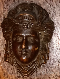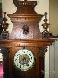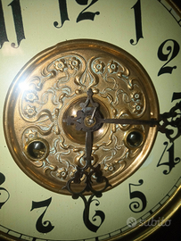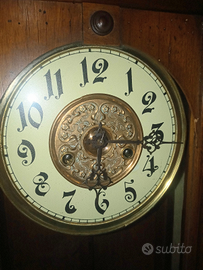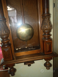 Orologio pendolo da muro stile umbertino fine 800 . cassa in legno . due colonne ai lati lavorate con foglie di acanto alla base e capitello corinzio in estremita' , figura di fanciulla in legno : italia turrita ? quadrante con numeri arabi e anello centrale in ottone finemente lavorato con lira e fiori . sportelli in vetro a vista meccanismo . suona la mezza e le ore .