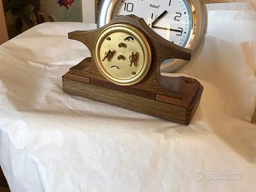 Particolare orologio con allarme prodotto dalla tedesca Peter negli anni 70.L’orologio ha un bel quadrante di circa 9 cm in diametro con fondo bianco,cifre romane e lancette di fattura molto accurata;logo in basso sotto l’origine delle lancette,sotto il 12 invece c’è’ il classico sotto quadrante che indica l’ora di allarme.Mobiletto in legno molto bello e in pratica senza alcun segno del tempo(ho dato solo un po’ di olio paglierino per ravvivarne le venature)arricchito da 2 borchie disposte simmetricamente sul piano mobile e da un piccolo stemma ovale dorato posto centralmente in basso.Il mobiletto nasconde uno scomparto “segreto”che si può’ visualizzare semplicemente facendo pressione sulla borchia orizzontale di sinistra e ruotando verso destra,la nicchia e’ rivestita di velluto rosso e può’ contenere i tipici orpelli del gentil sesso o anche un orologio da polso.Tic tac deciso,allarme potente.Altezza 18 cm,lunghezza max 27 cm,profondita’ max 11 cm,peso 1,1kg.Orologio ed allarme ben funzionanti,acquisto as is visto e piaciuto.