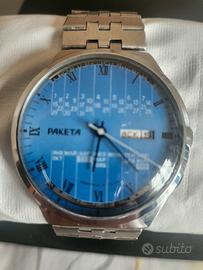 orologio russo raketa con calendario perpetuo, perfettamente funzionante e conservato ottimamente, carica manuale e cinturino in metallo, per amatori e collezionisti, con scatola, scambio a mano.