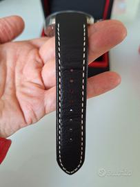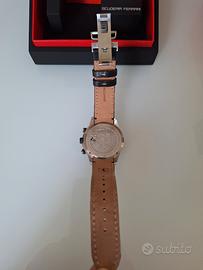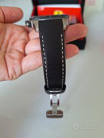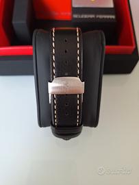 Orologio Scuderia Ferrari con scatole originali in condizioni perfette. Nome originale del prodotto: SCUDERIA FERRARI CHRONO BLACK RING WATCH, prezzo di listino originale €480. Cinturino in vera pelle nera con impunture, quadrante acciaio, resistente in acqua a 5atm, movimento Swiss Made Ronda 5030 D. Batteria nuova sigillata presente all'interno della scatola, garanzia scaduta.