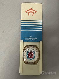 Orologio da polso, sovietico, Raketa City San Pietroburgo, prodotto tra gli anni 1990 – 1999 nella fabbrica di orologi Petrodvorets. Ha un design molto raro ed insolito. L’orologio, con matricola 978, è nuovo. A causa dell’inutilizzo nel tempo, risulta bloccato il meccanismo di ricarica. L'offerta comprende la confezione originale.