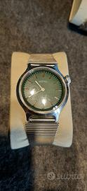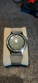 Articolo di designer militare sovietico di fattura anni 70/80 - dial verde con secondina interna all'indice sx delle h21 - completamente cromato con cintolino d'origine rigido cromato , quadrante con indici interni in rilievo dorato - orologio perfettamente funzionante e completo , originale dell'epoca - ottimo stato di conservazione-