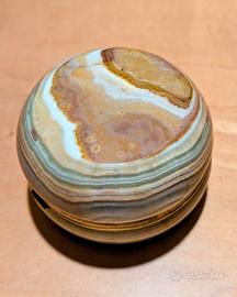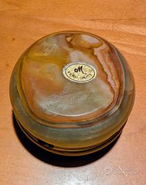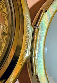Orologio sveglia Blessing Sveglia vintage del marchioBlessing, un produttore tedesco noto per i suoi orologi da tavolo e da viaggio negli anni '60 e '70. Orologio meccanico a carica manuale, in ottone e contenitore in elegante Onice naturale con venature colorate e finiture in ottone dorato. Quadrante analogico con numeri romani e lancette stilizzate. Il quadrante presenta numeri romani e un caratteristico design floreale o filigranato al centro.
