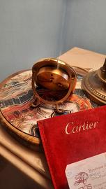Orologio sveglia da tavolo Cartier Romane, acquisto nel 1994. Prodotto in Svizzera. È perfettamente funzionante e conservato; l'orologio è completo di custodia in pelle originale Cartier, depliant, garanzia e porta garanzia e fattura di acquisto. L'oggetto poggia su un cavalletto con le iconiche C del brand Cartier. La cassa di ottone pieno placcato oro, il quadrante in smalto bianco firmato Cartier con numeri Romani e binario dei minuti in una cornice dorata lucida e smalto bordeaux. Sulle chiavi di regolazione dei minuti e sveglia sono incastonati due zaffiro blu taglio cabochon. Lancetta dei minuti e ore a spada nere; lancetta della sveglia color platino. numero di serie e marchio Cartier incise sul fondello. Dimensioni mm 70x80x5.