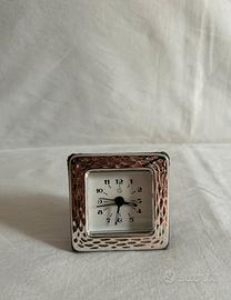Bellissimo orologio da tavolo vintage di Guido Galbiati, Made in Italy, con sveglia, batteria nuova già inserita, cornice frontale in argento 925 con raffinata lavorazione, retro in tessuto scamosciato, le dimensioni dell'orologio sono evidenziate nelle ultime foto.
