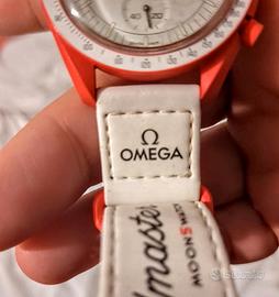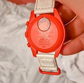 Orologio swatch omega tonalità rosso ardente in bioceramica. Impermeabile fino a 3 bar. Cinturino in velcro, quadrante bianco brillante.