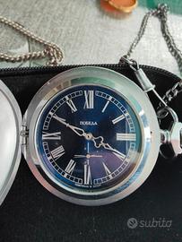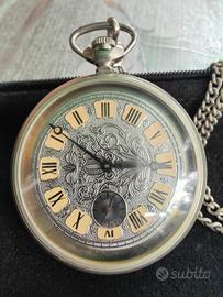 Presenta un quadrante con numeri romani e un piccolo quadrante secondario per i secondi a ore 6, tipico degli orologi da tasca classici.