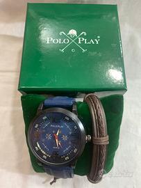 Un orologio da uomo della POLO PLAY analogico a batteria con cinturino in cuoio ed insieme in regalo un bracciale intrecciato da uomo sempre regolabile