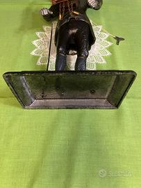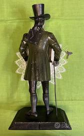 Originale orologio vintage a carica manuale, integrato in una scultura che raffigura un uomo con bastone e cappello a cilindro.