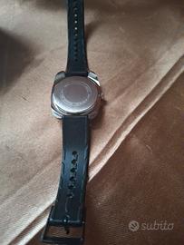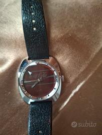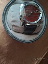 Vendo orologio meccanico a carica manuale firmato Coca-Cola, un iconico pezzo da collezione in stile Space Age. Caratteristiche: Movimento meccanico svizzero (senza batteria), cassa a cuscino cromata, quadrante bronzo con logo Coca-Cola e caratteristica lancetta dei secondi "fluttuante" a freccia. Funzionante, carica manuale . Vetro in plexiglass con leggeri segni di usura superficiali tipici dell'epoca. Include il cinturino originale marchiato "Swiss Made" e la custodia rigida originale con cerniera. Oggetto come in foto.