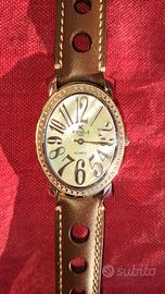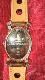orologio da donna Kienzle anni 90. pila nuovo, cinturino sostituito color marrone in pelle di vitello. fornisco comunque anche l'originale nero un pó usurato. resistente all'acqua. al quarzo. cassa 35 mm ovale con brillantini. lunghezza cinturino 23. no scatola
