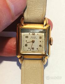 Le lancette e gli indicatori delle ore sono dorati. Così come per la parte superiore della cassa, non so se si tratti di doratura o di Oro. Il colore è comunque molto bello e luminoso. L'orologio è stato usato, ma, relativamente alla sua età, è in ottime condizioni: una leggera patina sul quadrante e qualche graffietto qua e là che nulla tolgono alla bellezza di un oggetto molto elegante.